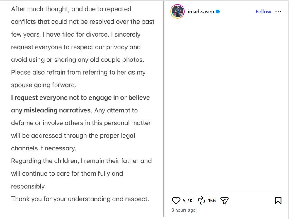 سوشل میڈیا پر جاری اپنے بیان میں عماد وسیم نے کہا کہ طویل غور و فکر کے بعد اور گزشتہ چند برسوں کے دوران پیدا ہونے والے ایسے اختلافات جن کا کوئی حل ممکن نہ ہو سکا، انہوں نے قانونی طور پر طلاق کے لیے درخواست دائر کر دی ہے۔